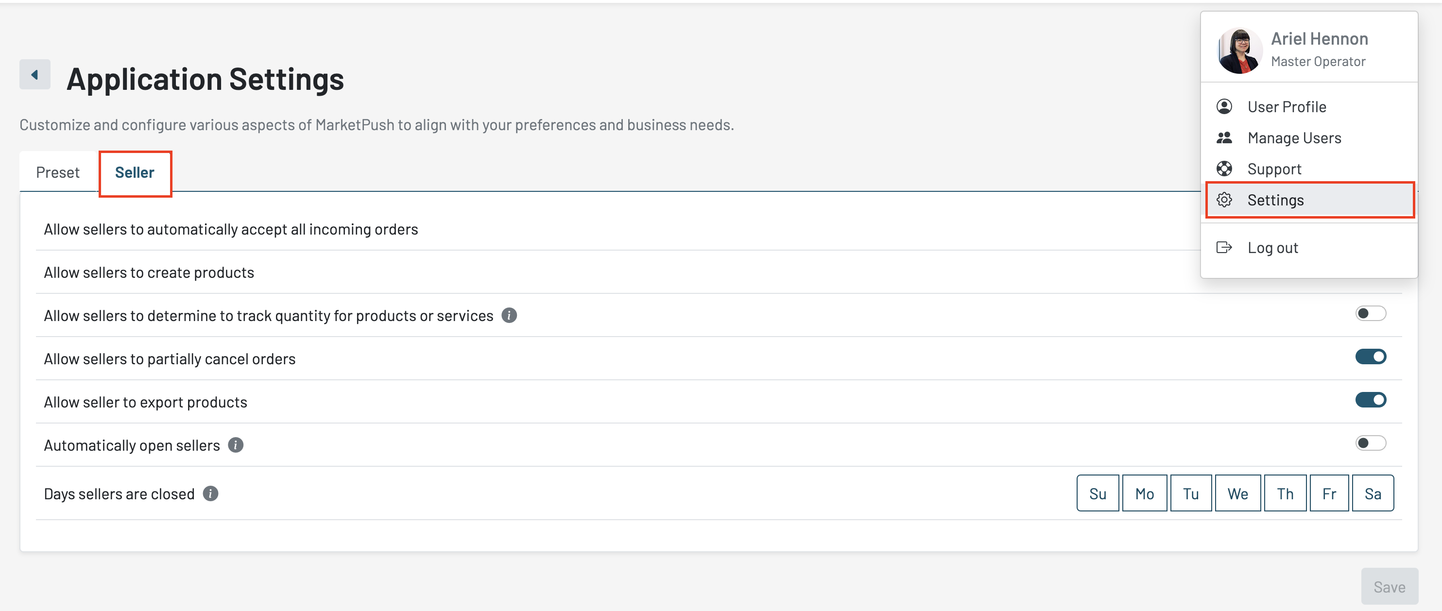 - Application Settings: Seller - Enable permissions for your sellers based on your business needs